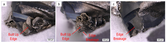 BUE and tool breakage at vc = 80 m/min and fz = 20.6 µm/tooth (a) edge 1; (b) edge 2; (c) edge 3.