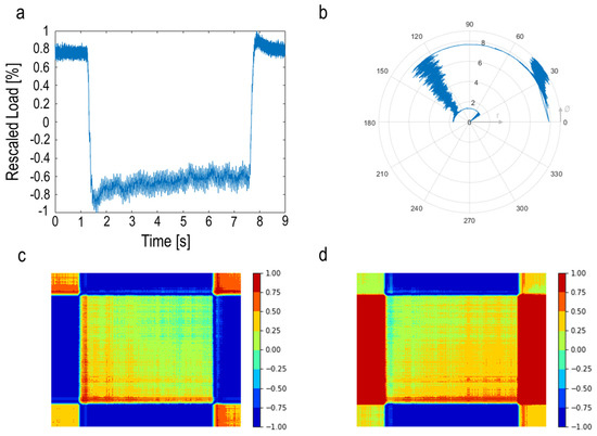 (a) Rescaled load signal; (b) polar coordinate mapping of signal; (c) Gramian angular summation field (GASF); (d) Gramian angular difference field (GADF).