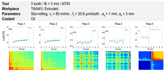 Figure 5 illustrates an example of these signals before the tool breakage. After the second pass, a considerable fluctuation in all types of the signal can clearly be observed. This can be associated with considerable built-up edge (BUE) at the dry milling of titanium alloys, that was eventually followed by tool breakage. Figure 6 shows a considerable BUE at vc = 80 m/min and fz = 20.6 µm/tooth that led to cutting edge and tool breakage.