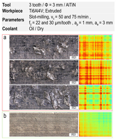 Exemplary milled surfaces and their corresponding GASF images; (a) at vc = 75 m/min and fz = 22 µm/tooth in dry machining and (b) at vc = 50 m/min and fz = 30 µm/tooth with oil.