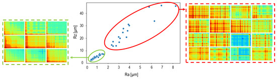 Figure 11 also shows the quantitative analysis of the generated surfaces from different milling series with respect to the roughness values (Ra and Rz). Accordingly, the images change significantly at higher values of Ra and Rz (red ellipse). Therefore, the GASF images from these tests were also included in group B.
