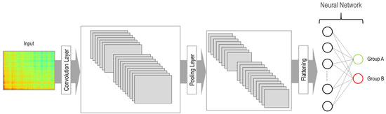 A convolutional neural network (CNN), a commonly applied method for machine learning of images, was used as a classification model in this study. Figure 12 illustrates the architecture of the developed CNN model. Two main components in this model are the convolution layer and the pooling layer. In the convolution layer, multiple filters are applied to the imported image. Each filter scans the entire image, and at each position, the similarity of the filter is compared with that area of the image. The output of the convolution layer results in several images that are smaller than the original image. The number of images corresponds to the number of applied filters. In the next step, the pooling layer is applied to reduce the size of the images and, correspondingly, the number of parameters to be learned as well as the number of computations performed in the network. Moreover, the pooling layer extracts the most important features of the image. Therefore, the images are imported from the convolution layer to the pooling layer, which results in a dimension reduction while preserving the important features of the images. Finally, the images are flattened and imported into the neural network for training.