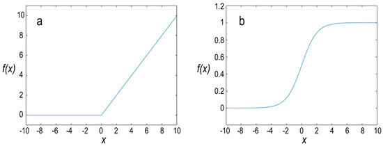 Accordingly, the ReLU function returns 0 if the value is negative and otherwise returns xi (See Figure 13a). The ReLU function results in improvement of computational efficiency in the deep learning model. Due to binary classification, the sigmoid function is used as an activation function in the last layer. Equation (6) describes the sigmoid function.