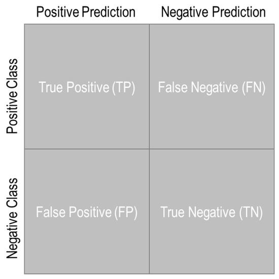 After training, the classification model is evaluated with respect to the accuracy, precision, and recall. For the calculation of mentioned metrics, a confusion matrix should be created for each test group. In the case of binary classification with two groups (positive and negative), the confusion matrix can be created as shown in Figure 14. Accordingly, each row of the matrix represents the instances in the actual classes, while each column denotes the instances in the predicted classes.