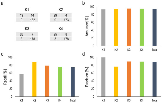 (a) Confusion matrix; (b) accuracy; (c) recall; (d) precision.