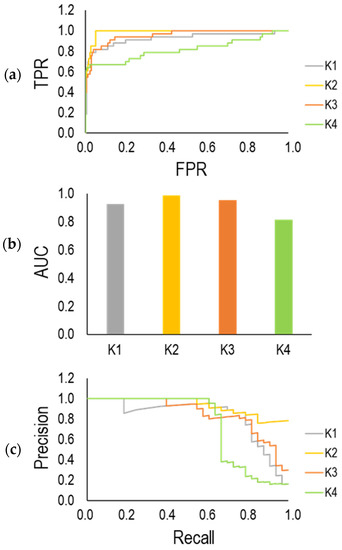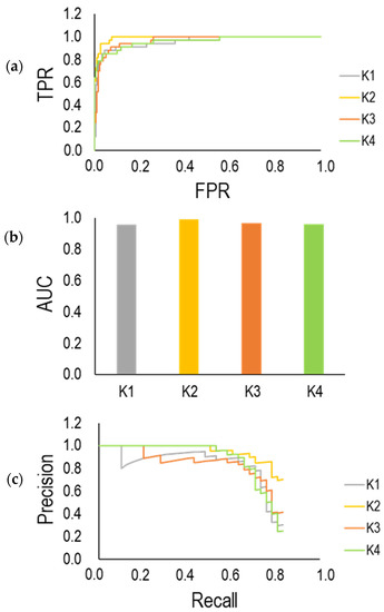 According to the above equations, TPR is defined as a proportion of true positive instances out of all actual positive instances that correspond to the model’s recall and sensitivity. FPR represents a fraction of false positive instances out of all actual negative instances. Figure 16a illustrates the ROC curve for four groups (K = 1, 2, 3 and 4). The classifier that provides a curve close to the top-left corner indicates a better performance based on the ROC curve. Accordingly, the trained model at K = 2 shows better performance compared to others. The lowest performance with respect to the ROC curve can be seen for K = 4. The area under the ROC curve as AUC is considered as another parameter for the evaluation of the classifier model. This parameter is ranged from 0 and 1. A higher value of AUC highlights better model performance. As shown in Figure 16b, AUC for all groups (K = 1, 2, 3 and 4) stands over 0.8. Figure 16c indicates the precision-recall curve that has been derived by calculation of recall and precision at different threshold values. It is desired that the classifier model has higher precision and recall. Therefore, the precision-recall curve closer to the top-right corner shows better performance. Correspondingly, the trained model classifier at K = 1, 2, 3 performed better than that at K = 4.