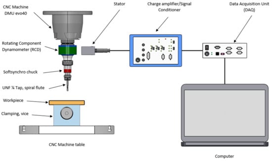 The experiments were performed using a precision CNC machining centre (DMG Evo40) and set up shown in Figure 4. A Kistler 9170A rotating dynamometer (RCD) to enable direct measurement of torque and thrust was secured to the machine spindle by an HSK63A taper adaptor. The stator was fastened to the CNC machine and allowed for adjustment. A soft synchronous tap holder (Emuge Softsynchro-1) was secured to the RCD by a 20 mm diameter precision collect with an ER32 locking nut. The tap tool was secured to the soft synchronous holder using a 7 mm diameter collet with a (ER20) locking nut. The soft synchronous holder was set to minimum compensation and the unsupported stick out length of the tap tool was 50 mm. A load versus speed test was performed under representative tap loading with machine spindle speed set to N = 120 rpm and measured using a TKRT 10 Optical Tachometer and the spindle speed error was below 1%.