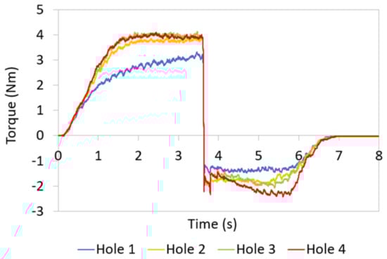 Set of typical torque results obtained for tapping a sequence of 4 holes using CFref.