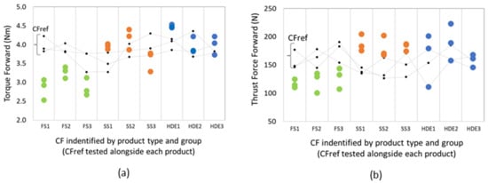 The Tf and Ff results of each CF identified by product and group are displayed in Figure 7. The CFref tested alongside each product is also displayed. Despite the rigor over the preparations and procedures, variability is present, nevertheless there is clear differentiation in performance among the CF products and groups. The raw data record of each test result was examined for outliers, but the typical performance trends were in accord with Figure 7b, justifying the approach using a single result from each column of 4 tapped holes.