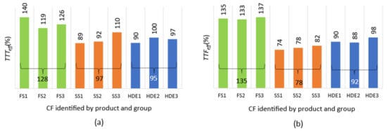 TTTeff (a) and TTFeff (b) obtained for each CF product with each group identified.