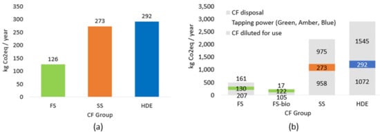 Figure 10b displays the GHG emitted from the CF groups over the three life cycle stages modelled. The FS group displays appreciably lower total GHG emission at (kg CO2eq per annum) 498 compared with 2208 and 2908, respectively, for the SS and HDE groups. The FS group displays significantly lower emission for the life cycle stages 1 and 4 than the SS and HDE groups. There is further environmental benefit in switching from FS to FS-Bio, with GHG emission reducing by half from 498 to 244 kg CO2eq per annum due to its biodegradability [].