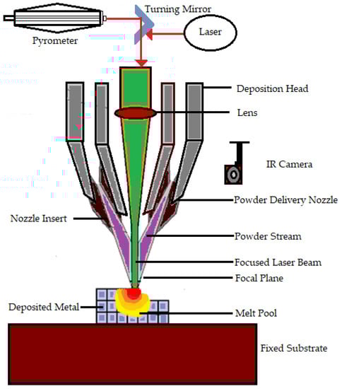 Bose S et al. [] explain DED as a process in which a direct source of energy is used to simultaneously deposit, melt, and solidify the material that is fed as either a powder or as a filament. Electron beam or lasers are mainly used as the direct energy source. Yousuf S et al. [] say that the continuous feeding of starting material is needed in the form of powder or filament for the process. Then the feeding material becomes melted by the energy source and becomes deposited in a layerwise pattern. The heat conduction in direct energy deposit processes is more effective because the heat, material, and shield gas are transferred directly from the nozzle to the build area. The laser direct deposition technique is the most popular one that falls under this category []. DED features a nozzle that moves around multiple axes. Davoodi E et al. mention that the DED process can be used for fabricating a wide range of metallic biomaterials. Moreover, this technique has proven its capability of manufacturing porous biomedical implants []. Furthermore, multimaterial structures produced by DED have benefits and can be constructed using existing technology and process management []. DED is faster and less expensive as compared with powder bed fusion when creating midsize metal parts []. Even though DED is a method having various advantages, it has certain disadvantages, such as support structures being necessary for overhangs, limitations in producing complex shapes, and lower accuracy than powder bed fusion AM processes []. The working of DED is shown in Figure 1.
