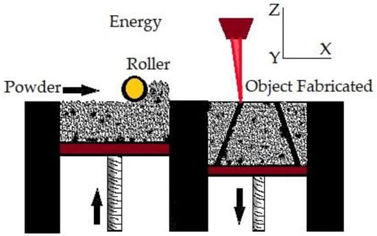 In PBF, very fine powders are used as thin layers and are evenly and densely stacked on a platform. The particles in each layer are fused using a laser beam or a binder []. PBF approaches allow for excellent dimensional precision at large relative densities [] often with high repeatability and surface roughness []. Additionally, the process has high porosity when the powder is forced with a binder []. PBF uses thermal energy to fuse certain areas on the powder bed. PBF is one of the first generation of commercialized AM processes []. The printing processes of PBF and binder jetting are similar. N Derimow et al. [] say that an oxidation-free environment is needed for PBF to prevent oxidation of the feedstock powder. A hopper or a reservoir below the side of the bed provides fresh material supply. PBF’s advantages include the fact that it has less material wastage and less cost, improves production development times, enables rapid prototyping and low-volume production, is capable of building functionally graded parts, performs efficient recycling of unmelted powder, and provides elimination of the need for machining fixtures []. In addition, even though the high powder density across the build geometry can act as a self-support [], the PBF approach frequently requires structural support to combat shape distortions of the manufactured sample. In the case of titanium, PBF can create materials with high strength, high detail, and load bearing []. On the other hand, using tiny, spherical metallic powders enables high packing densities, enhances component consolidation, and reduces flaws []. Behzad Fotovvat et al. [] focuses on the PBF–AM technique of direct metal laser sintering for Ti-6Al-4V ELI material’s dimensional precision. The impact of size, geometry, and position on the build platform was studied using a variety of geometric pieces with different thicknesses and sizes. They came to the conclusion that accuracy is not affected by where the components are placed on the build platform and that this method typically produces high-resolution results. They concluded that inaccuracy is not a function of the location of the parts on the build platform, and such process usually shows results with high resolution. Meanwhile, from the findings of Samira et al. [] when compared with laser metal deposition, laser PBF provides the best level of accuracy for dimensions, perpendicularity, and position tolerance. The PBF process is shown in Figure 3.