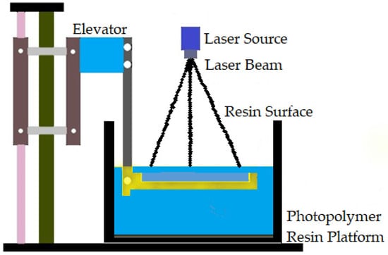 The first commercially available AM technology is vat polymerization. It produces parts through selectively curing liquid photoreactive polymers []. Vat polymerization is also known as stereolithography (SLA). This process has high accuracy in building parts, superior part quality, and quick construction pace []. This technology is known for its smooth surface finish and highly detailed parts, average build speed, and a wide range of materials []. The SLA process is based on layer-by-layer photosensitive resin polymerization using UV light []. Increasing the number of parts reduces the time per part in vat polymerization. Support structures are essential in the case of vat polymerization []. Biomaterials in large sizes can be manufactured by vat polymerization using different materials, such as metal, ceramics, and polymers. Figure 4 shows the vat polymerization technique.