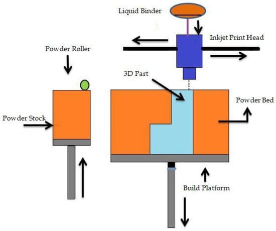 Binder jetting (BJ) is a powder-based AM process that employs a liquid binder, instead of an electron beam or laser source, for locally binding the powders and creating the intricate ceramic, polymeric, and metallic structures []. Shick T M et al. [] mentioned that to form a designed structure layer by layer in the BJ technique, the liquid binding agent is spread to a selected area on the power bed based on the part geometry. The binder acts as an adhesive to bond the powder layers. In a normal BJ system, there are three axes, namely x, y, and z. The x and y axes are responsible for the horizontal position, and the z axis refers to the depth for x and y []. For a successful build, the binder jetting needs an understanding of many process variables. BJ is able to be conducted on dry powders as well as on wet powders. Fine powder BJ can give good surface finishing and low surface roughness []. There are two types of binders: organic and inorganic. Binder jetting is capable of printing a variety of materials, including metals, sands, and ceramics []. A schematic representation of binder jetting is shown in Figure 5.