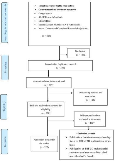 The inclusion and exclusion criteria used to select the relevant articles to establish the degree of success attained using the PBF technology to produce multimaterial 3D structures and the way forward is presented in Figure 1. A total of 483 articles were retrieved through various electronic databases. The abstracts and conclusions of the selected 483 articles were reviewed for eligibility. After the eligibility check, 107 articles that did not specifically focus on powder bed fusion of multimaterial 3D structures were excluded. A total of 270 full-text articles were read and 48 articles that did not comprehensively focus on the current research topic were excluded. A total of 222 articles were finally used for the studies.