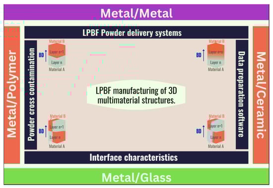 According to the distribution of dissimilar materials, the main materials that are used in the LPBF process for multimaterials fabrications are metals, polymers, ceramics and glasses. The use of multiples materials results in different material interfaces (e.g., metal–glass, metal–polymer, metal–metal, metal–ceramic, polymer–polymer, polymer–metal, polymer–glass, polymer–ceramic, ceramic–ceramic, glass–glass, etc.); therefore, different technological barriers need to be overcome for successful manufacturing of the various multimaterials structures. Each set of the multimaterials (e.g., metal–metal, metal–polymer) presents a unique interface challenge that needs to be overcome to enable the manufacturing of intricate 3D structures in which the directionality of the materials are controllable to vary the distribution of the various materials within a complex three-dimensional (3D) space [].