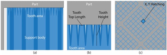 In metal AM and LPBF, there is a wide range of support types available, such as block, point, web, contour, and line [,]. Their choice depends on the geometry and the features of the part, the selected material, and the compatible slicing software []. According to the literature, the most commonly used support type is LPBF, and the one that was investigated in this research is the block type. Fragmented block-type supports are preferred for a wide range of applications, since their configurable morphology is ideal for reducing material consumption and removal effort. A sample of their morphology is shown in Figure 1. It can be observed that they are divided into two parts: the support body, which is the main geometry of the support structures; and the tooth area, which is based on the contact area between the supports and the part’s overhang surface, as illustrated in Figure 1a.