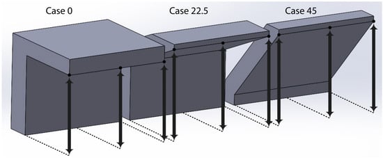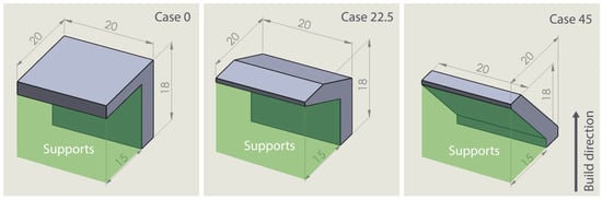 To be able to evaluate the effect of the aforementioned parameters on the support structures, ledge overhang specimens were designed, based on the published works referenced above. Three different specimens were selected (case 0°, case 22.5°, and case 45°) according to the respective Overhang Angle levels. The specimens’ geometry, their dimensions in mm, the Overhang Angles followed by the supported area, and the build direction of the parts are shown in Figure 2.