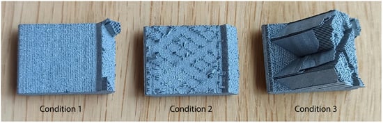 The removability was evaluated according to the effort needed to remove the supports and clean the overhang surface of support remnants. It is worth mentioning here that most of the support structures were removed while detaching the specimens from the build plate. The rest were removed manually using basic tools such as wire cutters, pliers, and files. Three different conditions were considered to evaluate the removability. In “condition 1”, supports were very easy to remove and not much effort was needed to clean the surface. In “condition 2”, supports were easy to remove but more effort was needed to clean the surface. In “condition 3”, supports were very difficult to remove manually, risking the quality of the printed part. These three conditions are illustrated in Figure 4. The non-printed specimens were not included in the removability evaluation.