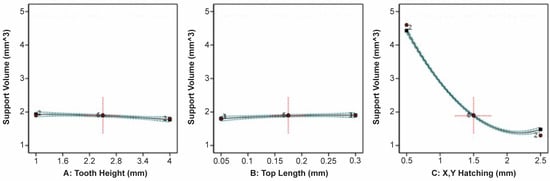 - X, Y Hatching has the most significant effect on Support Volume. The minimum Support Volume was observed at higher levels of X, Y Hatching (4 mm), while Tooth Height and Tooth Top Length barely affect Support Volume.