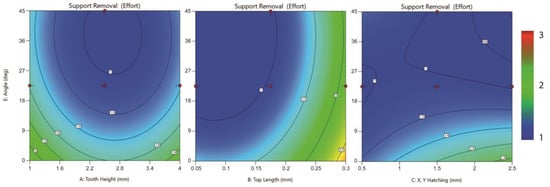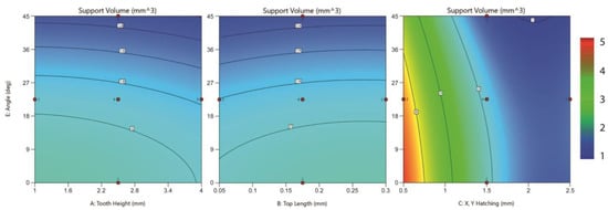 The effect of Tooth Height, Tooth Top Length, and X, Y Hatching on Support Volume is illustrated clearly in Figure 6. It was found that as Tooth Height increases and Tooth Top Length decreases, Support Volume barely decreases. On the other hand, as X, Y Hatching increases, Support Volume decreases extremely. This is because a significant amount of material is removed from the support structure’s main body as the total number of inner walls decreases. Thus, it was observed that the minimum support volume for all the specimens could be achieved at higher levels of Tooth Height (4 mm), lower levels of Tooth Top Length (0.05 mm), and higher levels of X, Y Hatching (2.5 mm). This is also observed in Figure 7, where relative contour plots illustrate the interaction between the support parameters and the different Overhang Angles on Support Volume.