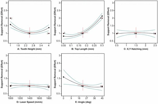 The effect of Tooth Height, Tooth Top Length, X, Y Hatching, Laser Speed, and Overhang Angle on Support Removal Effort is illustrated in Figure 8. It can be seen that Support Removal Effort decreases for average values of Tooth Height. It was also found that as Tooth Top Length decreases, the removal effort decreases greatly. This is because, at higher levels of Tooth Top Length, the bonding area between the part and supports was stronger, and as a result, the supports were difficult to remove. In addition, extra effort was needed to extract metal remnants from the surface. X, Y Hatching and Laser Speed barely affected the removal effort, while it can be observed that Support Removal Effort decreases as Overhang Angle increases.