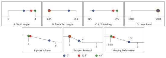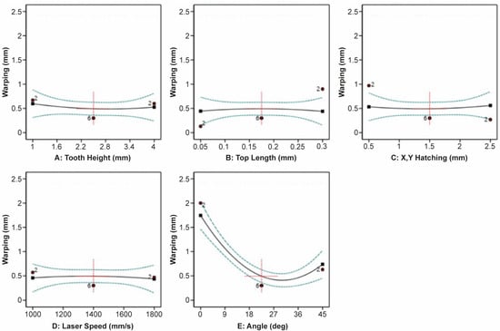 The effect of Tooth Height, Tooth Top Length, X, Y Hatching, Laser Speed, and the different overhang angles on Warping Deformation is better illustrated in Figure 11. It was found that, for 0° overhangs, Warping Deformation could be decreased at higher levels of Tooth Top Length (0.3 mm) and lower levels of X, Y Hatching (0.5 mm), while Tooth Height and Laser Speed do not significantly affect Warping Deformation. On the other hand, for 45° overhangs, Warping Deformation decreases at higher levels of Tooth Height (4 mm), lower levels of Tooth Top Length (0.05 mm), and higher levels of X, Y Hatching (2.5 mm), while Laser Speed barely affects Warping Deformation. It was also found that for all of the parameters, the minimum Warping Deformation could be observed at average levels of Overhang Angle between 20° and 40°.