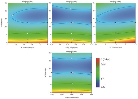 The effect of Tooth Height, Tooth Top Length, X, Y Hatching, Laser Speed, and Overhang Angle on Warping Deformation is illustrated in Figure 10. It can be observed that Warping Deformation significantly decreases as Overhang Angle increases. This is also because all the non-printed specimens consisted of 0° overhangs. Based on the printed outcome, it was observed that the highest value of X, Y Hatching (2.5 mm) results in low-density support structures unable to support the 0° overhang area, explaining why none of the 0° specimens with 2.5 mm hatching distance was printed successfully.