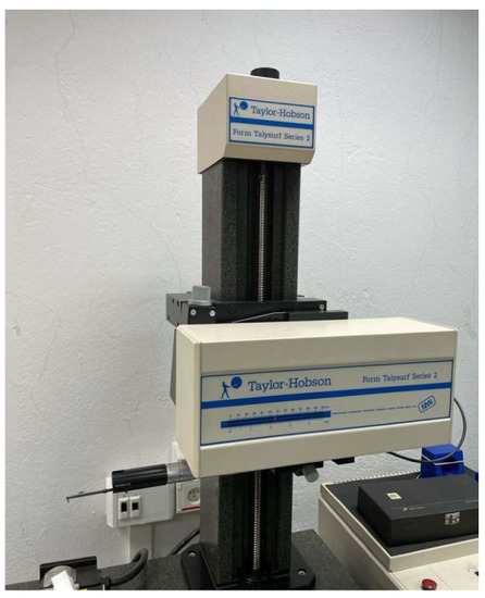 Roughness was measured with a Taylor Hobson Talysurf 2 contact roughness meter, as shown in Figure 3, with a Gaussian filter with cut-off value of 0.8 mm. Evaluation length was 4 mm. A diamond tip was used with tip radius of 2 µm and tip angle of 90°. Resolution of the inductive sensor was 18 nm and the measuring force was 1 mN.