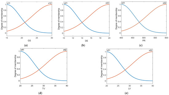 Membership functions for fuzzification of the inputs for: (a) GS; (b) DE; (c) PR; (d) TV; (e) LV.