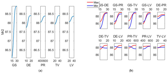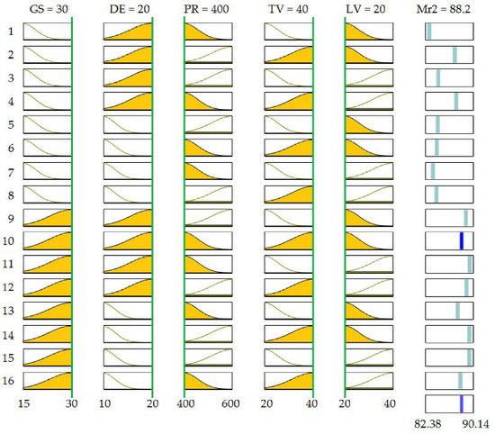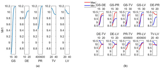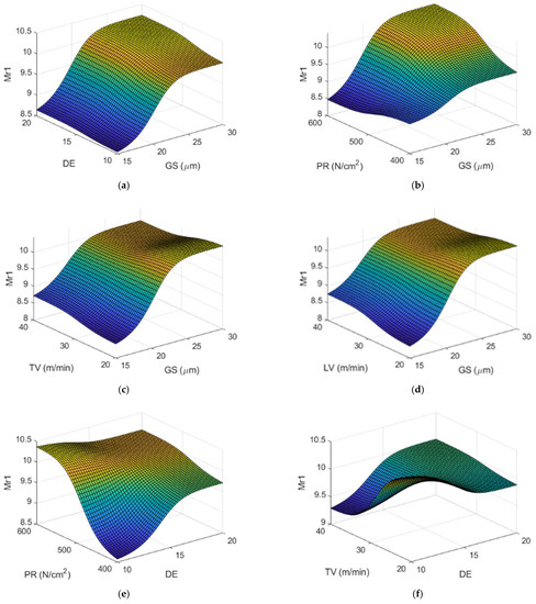 Figure 13 depicts the main effects and the interaction effects plot for (Mr2). As can be observed, the main effect for (Mr2) is grain size. On the other hand, most significant interactions correspond to GS-DE, GS-PR, GS-TV and GS-LV. Anderberg et al. found a great correlation between (Mr1) and (Mr2) in honing processes [38].
