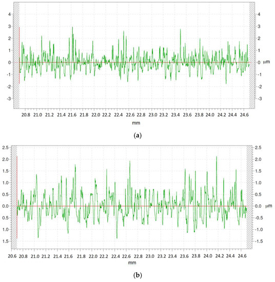 Roughness profiles of: (a) Experiment 9, obtained with high pressure of 600 N/cm2; (b) Experiment 11, obtained with low pressure of 400 N/cm2.