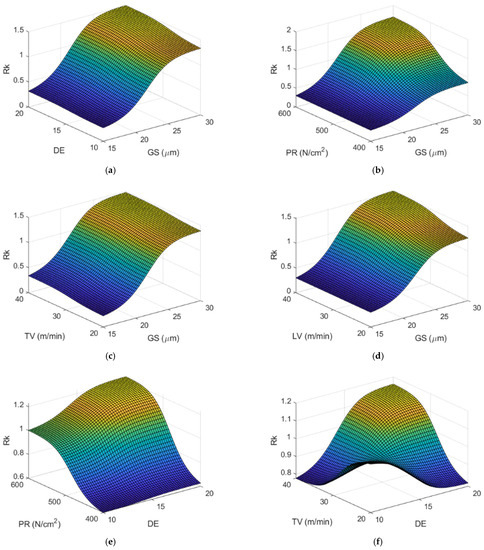 Figure 15 corresponds to the main effects plot and the main interactions plot for (Rsk). It can be observed that the main effect for (Rsk) is grain size, followed distantly by pressure. Most significant interactions correspond to those of (GS) with all the other variables. In this work, (Rsk) increases with grain size. Conversely, in the grinding processes of Inconel, (Rsk), a larger grit size results in lower (more negative) (Rsk) values [39]. In polishing operations of copper parts, the corresponding areal skewness parameter (Ssk) decreases slightly with grain size up to a certain grain size value from which it increases [40].