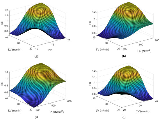 Response surface for (Rk (µm)) versus each pair of input variables while the rest are kept at their central values, using the ANFIS developed for (Rk): (a) GS and DE; (b) GS and PR; (c) GS and TV; (d) GS and LV; (e) DE and PR; (f) DE and TV; (g) DE and LV; (h) PR and TV; (i) PR and LV; (j) TV and LV.