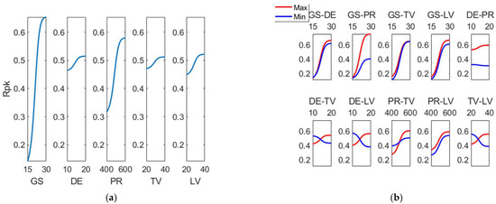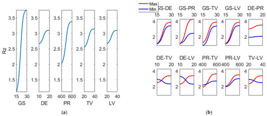 Figure 14 corresponds to the main effects plot and the interactions effect plot for (Rz). As with (Rk), the main factors are GS and PR, and the main interactions are those related to GS.