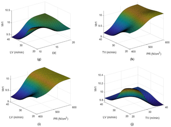 Response surface for (Mr1 (%)) versus each pair of input variables while the rest are kept at their central values, using the ANFIS developed for (Mr1): (a) GS and DE; (b) GS and PR; (c) GS and TV; (d) GS and LV; (e) DE and PR; (f) DE and TV; (g) DE and LV; (h) PR and TV; (i) PR and LV; (j) TV and LV.