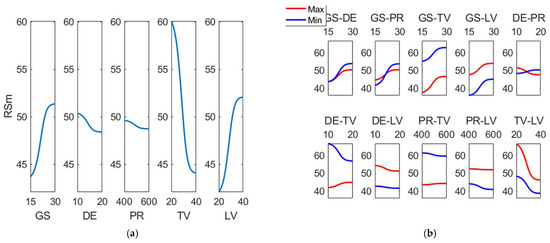 (a) Main effects plot and (b) interaction effects plot for RSm (µm).