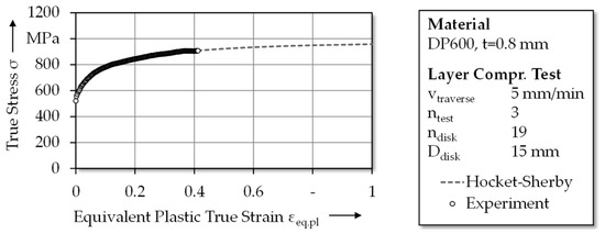 For describing the hardening behavior of the considered sheet metal, the flow curve under compressive loading is given in Figure 2 [11]. The true strain–stress curve of a layer compression test following [13] is extrapolated by the approach of Hockett and Sherby [14]. It represents the correlation of forming and strain hardening which is intended and relevant for the change of mechanical properties during the notching process. The remaining mechanical properties of the sheet metal are derived by tensile tests and may be found with further details on the plastic flow characteristics in [11].