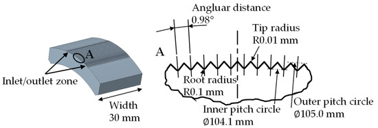 For the production of wire strip by a notch rolling process, a modular rolling pair with an exchangeable functional element is manufactured for use on the rolling stand EW 105 × 160 (Bühler Redex GmbH, Pforzheim, Germany) at the Institute of Manufacturing Technologies (LFT, Erlangen, Germany). The functional element is provided with a notched profile which is transferred on the workpiece during rolling. For notch rolling, two general process layouts exist: transversal and longitudinal, as presented in [11], whereas the patented process chain initially foresees transversal production [6]. It enables adjustment of fiber length based on the sheet’s width without following cutting and is thus considered in this study. Figure 3 pictures a detailed sketch of the used transversal functional element. As seen, only part of the perimeter is notched due to very small notch dimensions and high production costs for precise EDM. The geometry results in an unrolled notch distance w of 0.9 mm and a notch angle α of 90°. Four notches on each side with higher tip radii are considered for the infeed and outfeed. In the middle, 17 notches with constant notch tip radius are manufactured. The actual averaged tip radius rk,t was measured to 26 µm (target: 10, SD 3 µm) by the optical measuring system InfiniteFocusXL200 (Alicona Imaging GmbH, Raaba, Austria).