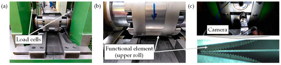 The rolling setup applying the transversally notched functional element is given in Figure 4. For monitoring the rolling forces, load cells are implemented in between the bearings of the upper roll and the feeding which is operated by a hand wheel (Figure 4a). The functional element, seen in Figure 4b for the upper roll, is clamped within the clamping rings on both rolls. For checking on the rolls’ position to minimize the offset of upper and lower notch tips, a camera system is added (Figure 4c) showing the rolling gap. The setup enables force and picture recording for further evaluation of the notch rolling process. For the determination of the rolling gap as precisely as possible, a tactile dial gauge of an accuracy of 1 µm measures the movement of the bearings of the upper roll. The reference point is identified based on the contact position of both rolls outside the notched region and the geometric characteristic of the notches.