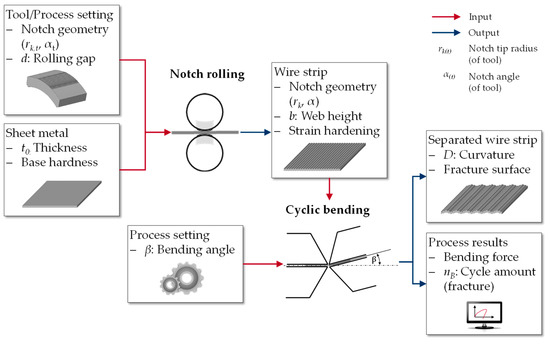 The experimental study evaluated cause–effect relationships for cyclic bending experiments of rolled wire strip until total material separation to enable comparison with results of [10]. For a target-oriented experimental design, the linkage of the process chain based on in- and output parameters during the process steps was elaborated. Due to the great number of parameters, a preselection was reasonable for better overview and useful analysis. Figure 6 presents a schematic listing of the considered parameters and tries to picture the interdependence of the process steps that add up to the final product, separated wire strip. The sheet metal was the input product for the notch rolling process. In addition, the notch geometry of the rolling tool (notch tip radius rk,t, notch angle αt) and the rolling gap d influence the process results. As output, the resulting wire strip can be characterized. Considered properties are the geometry of the notch (rk, α), the web height b and strain hardening. In turn, the wire strip’s characteristics resulting from the notch rolling process function as input parameters of cyclic bending. As further influencing parameter, the cyclic bending angle β is considered. Bending forces, the amount of cycles until fracture nB and the characteristics of the separated wire strip regarding fracture geometry are evaluated.