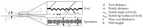 The notch sharpness is defined by the notch tip radius rk and the notch angle α. From the considered experiments, notch tip radii of 0.045 mm (dmin = 0.3 mm), respectively, 0.044 mm (dmin = 0.5 mm) result. No effect of the tool distance on rk can be detected. The notch angle α was measured to 92.9° (dmin = 0.3 mm) and 96.7° (dmin = 0.5 mm). It shows dependence on dmin, correlating with the greater portion of plastic deformation when reducing the tool distance. The smaller dmin, the smaller α and the more the wire strip’s angles approaches the tool’s angle αt (90.7°).