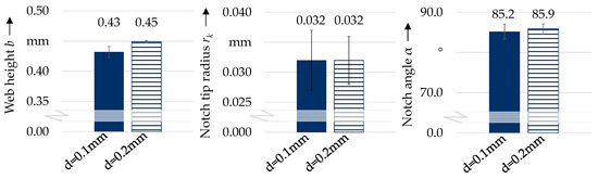 The rolling process’ parameters directly influence the resulting wire strip and thus indirectly effect the specimen’s behavior during cyclic bending, as indicated in Figure 6. To describe such effects on the wire strip’s properties and to draw conclusions on the impact on cyclic bending, the varying geometric and metallographic characteristics of the wire strip depending on the different settings of d (0.1 and 0.2 mm) are presented. Figure 8 depicts the resulting geometric properties by comparing the resulting web height b, notch tip radius rk, and notch angle α. As already mentioned, the relatively low settings of d were chosen due to detect the spring-back of the rolling stand. Such behavior can be derived from the resulting web heights b which are about 0.43 (d = 0.1 mm) and 0.45 mm (d = 0.2 mm). b decreases when decreasing the rolling gap because of increasing the portion of plastic deformation, but the differences in the two settings are not as pronounced as expected, which indicates challenging roll gap adjustment.