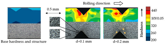 Hardness distribution and grain elongation in the micrographs indicate higher deformation and strain hardening on the left flanks, facing away from the rolling direction. The tool’s tip first forms that flank and shoves material in rolling direction, as indicated by the arrows in Figure 9. The hardness level of the wire strip rolled with d = 0.1 is higher than with d = 0.2 mm. Especially towards the middle of the sheet, higher hardness values can be detected. Over the web height in-between upper and lower notch, hardness values of about 392 HV for d = 0.1 mm and about 20 HV lower (368 HV) for d = 0.2 mm were measured.