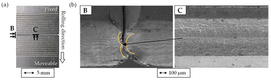 The cyclic bending of rolled wire strips applying the described tool setup was performed and interpreted to evaluate the impact of the parameter settings on the crack propagation. The parameter study given in Table 1 considers the variation of the notch rolling parameter d (rolling gap), whose resulting wire strip’s properties were described above, and the cyclic bending parameter β (bending angle). Figure 10 shows pictures of a separated specimen for d = 0.1 mm and β = 10°. The frontal view B illustrates a characteristic curvature of the crack propagation. The resulting fracture geometry is defined by one arc (side clamped by moveable jaw pair) respectively two arcs (side clamped by fixed jaw pair). This identifies two-sided crack growth and coalescence of the two cracks in the middle. The distinctive line of coalescence can also be seen in the view of the fracture surface C. During crack initiation, more plane fracture surface results that becomes coarser during crack propagation towards the middle.