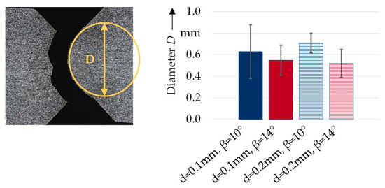 All bent wire strips exhibit a characteristic geometry as described above and seen in Figure 10, but differ in the pronouncement of curvature. To quantify the differences of various parameter settings, the curvature diameter D of the crack edge that was clamped by the moveable clamping pair is measured and compared as seen in Figure 11. The averaged diameter ranges from 0.52 (d = 0.2 mm, β = 14°) to 0.71 mm (d = 0.2 mm, β = 10°). The higher the bending angle, the more pronounced the resulting curvature. A direct effect of the rolling gap on D cannot be derived. It is debatable if the orientation of curvature (convex/concave) is caused by boundary conditions due to clamping or by the pre-deformation through the rolling process. However, the size of the curvature defines the geometric equality of both sides of the fracture. The higher D, the more uniform the crack growth direction, which would result later in wires/fibers with symmetric geometries.