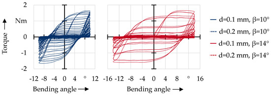 Figure 12 presents the averaged torque-bending angle curves of all performed cyclic bending tests. The hysteresis reached maximum torques of about 1.6–1.8 Nm and show decreasing progress for all experiments, ending in a course with no more changes. During the first cycles, the curvature of a stroke is uniform. Later on, the curvature changes from negative acceleration to positive acceleration towards the torque maximum. This indicates damage evolution overlaying the typical elastic-plastic material behavior. Experiments with a bending angle of 14° reach about 0.1 Nm higher maximum torque than with a bending angle of 10°. The maximum torque of both considered bending angles hardly differentiated, since during the first cycle, the course showed no more significant rising after approximately 8°. The torque level of the first cycles of wire strip rolled with a lower rolling gap (d = 0.1 mm) is about one-tenth Nm lower than for a higher rolling gap (d = 0.2 mm). The higher the rolling gap, the higher the cross-section, and the more effort was required for bending the notch. The differences between the two settings of the rolling gap decrease with progressing cycle amount.