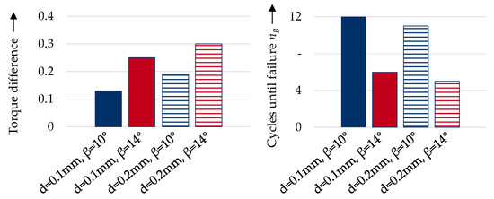 The definition of material failure according to the torque-angle curves is performed based on no more detected relevant change in the torque level. Although the determination method is subjective, it presents a reasonable base for evaluating the differences caused by the different considered parameter combinations. Figure 13 presents the amount of cycles until failure nB rounded to whole numbers. The lowest cycle amount result from experiments with a bending angle of 14°. Within the experiments of one bending angle setting, tests with wire strip produced with lower rolling gap (d = 0.1 mm) fail slightly later than with higher rolling gap (d = 0.2 mm). This might be caused by the different amount of penetration that results in different characteristics of rolled wire strip.