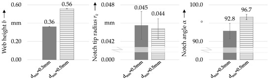 For deriving an equivalent of notch rolling by notch stamping, relevant characteristics of wire strips have to be mapped. To do this, the properties of stamped wire strips must first be specified. The characteristics of experiments with dmin = 0.3 and 0.5 mm are presented and interpreted. The resulting wire strip’s geometries, web height b, notch tip radius rk, and notch angle α, can be read from the diagrams in Figure 14.